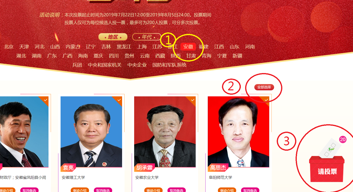 2.进入投票网页后,依次点击“安徽”——“全部选择”——“请投票”。(如下图)