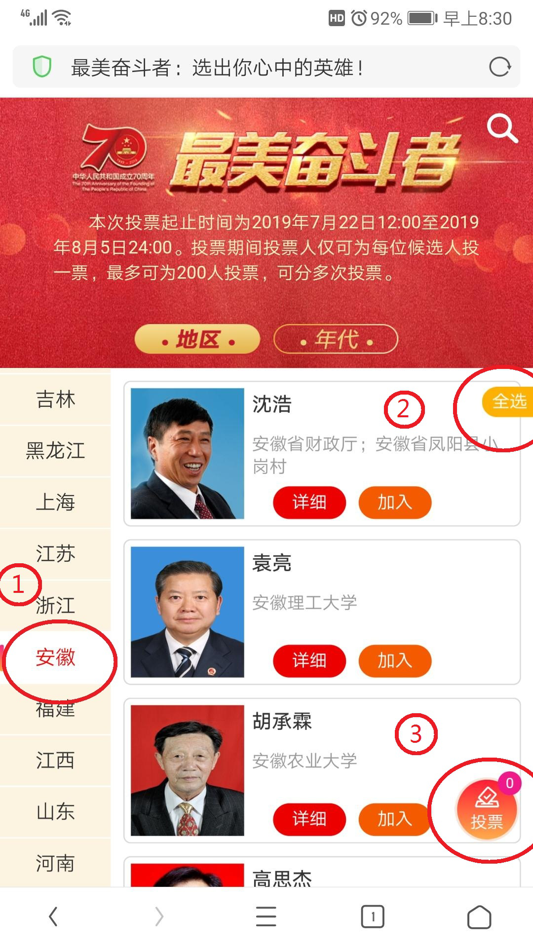 2.进入投票网页后,依次点击“安徽”——“全选”——“投票”。(如下图)