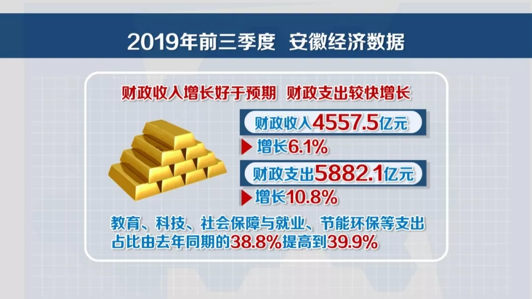 前三季度,全省财政收入4557.5亿元,增长6.1%,比全国高2.8个百分点。财政支出5882.1亿元,增长10.8%,其中教育、科技、社会保障与就业、节能环保等支出占比由去年同期的38.8%提高到39.9%。