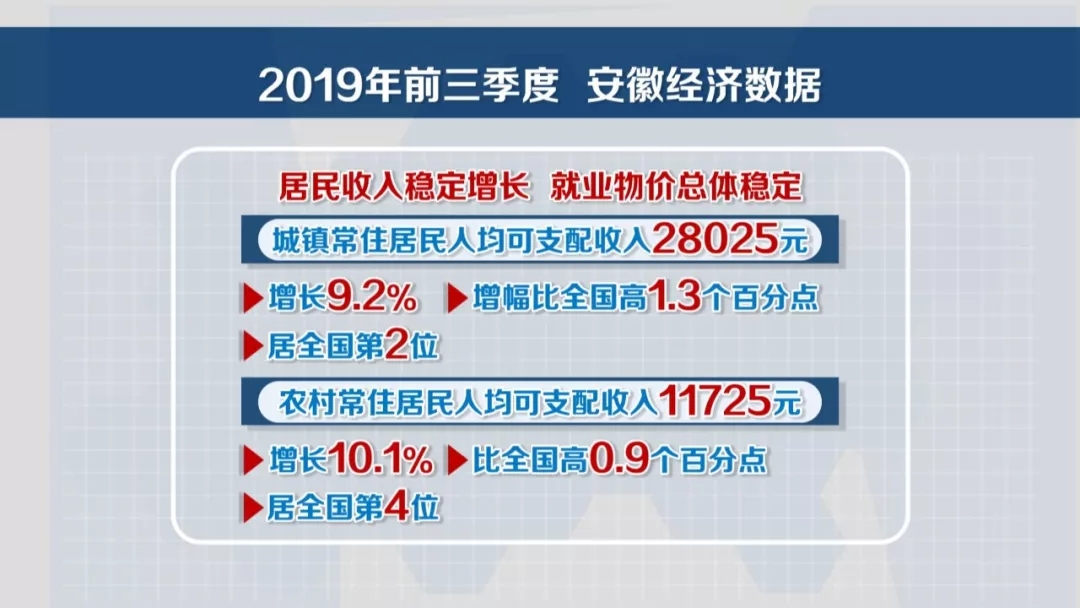 前三季度,全省城镇常住居民人均可支配收入28025元,增长9.2%,增幅比全国高1.3个百分点,居全国第2位;农村常住居民人均可支配收入11725元,增长10.1%,比全国高0.9个百分点,居全国第4位。