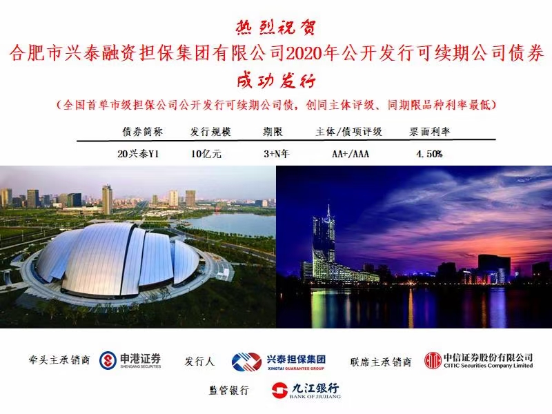 11月26日,兴泰担保集团在资本市场首次公开亮相,成功发行2020年公开发行可续期公司债券(债券简称“20 兴泰 Y1”,债券代码“175488”),为全国首单市级担保公司公开发行的可续期公司债,发行规模10亿元,债券期限3+N,票面利率4.50%,较近期(11月10日以来)同类可比债券平均发行利率低16个基点,创同主体评级、同期限品种利率最低,预计节约资金成本约480万元。