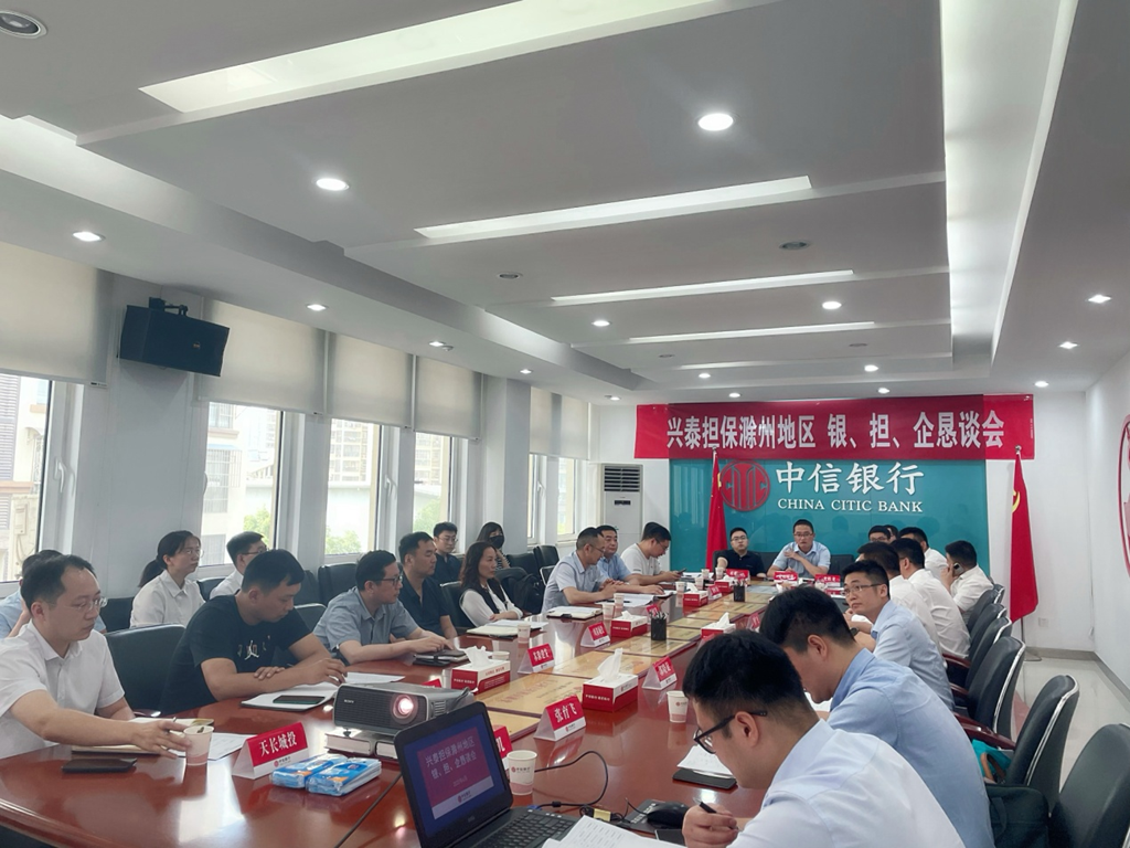6月9日,应中信银行滁州分行邀请,合肥市兴泰融资担保集团有限公司(以下简称“兴泰担保集团”)债项业务团队和保函业务团队赴滁州市参加银担企恳谈会,开展业务宣讲。滁州市各级平台公司参加会议。