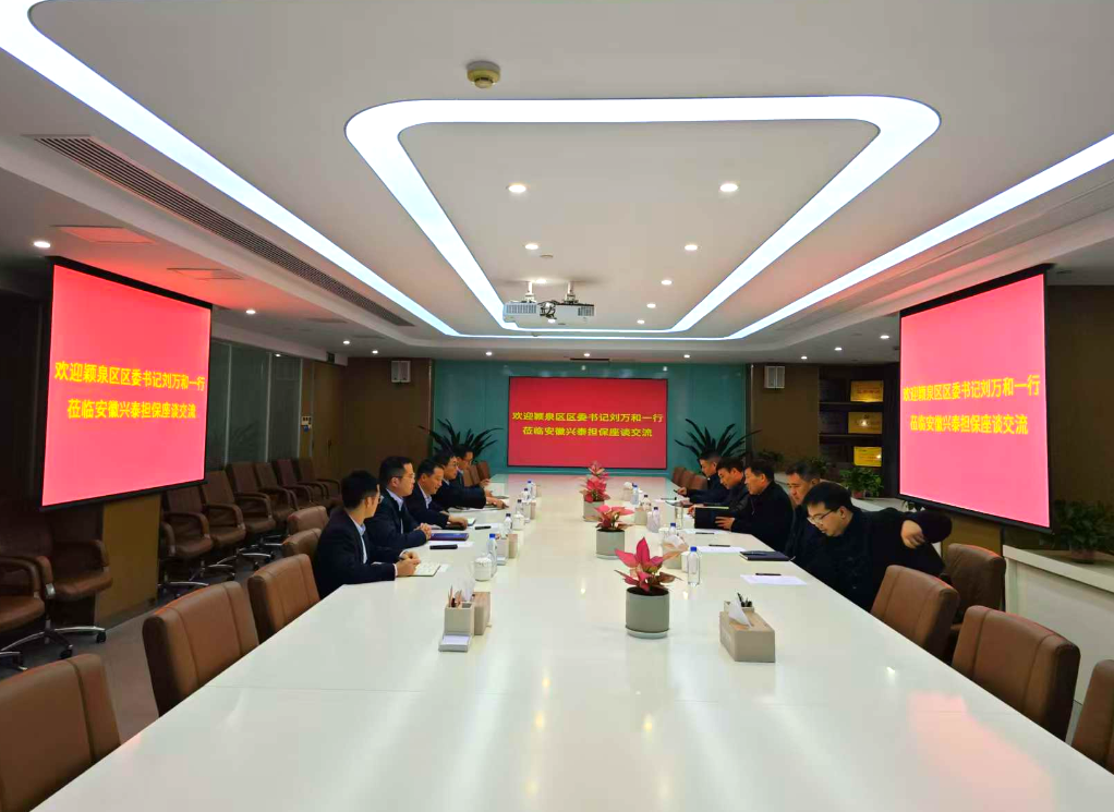 会上,戚威对刘万和一行表示热烈欢迎,并介绍了安徽兴泰担保的发展历程、体系建设、业务开展等内容。戚威表示,安徽兴泰担保一直致力于聚合行业资源、营造便捷高效的融资环境,助力行业创新发展机制,从而更好地发挥支持实体经济、服务区域经济高质量发展的功能。刘万和表示,安徽兴泰担保现已发展成为主体信用等级AAA的全国性担保机构,取得的成绩令人瞩目,希望颍泉区和安徽兴泰担保进一步提升合作广度。